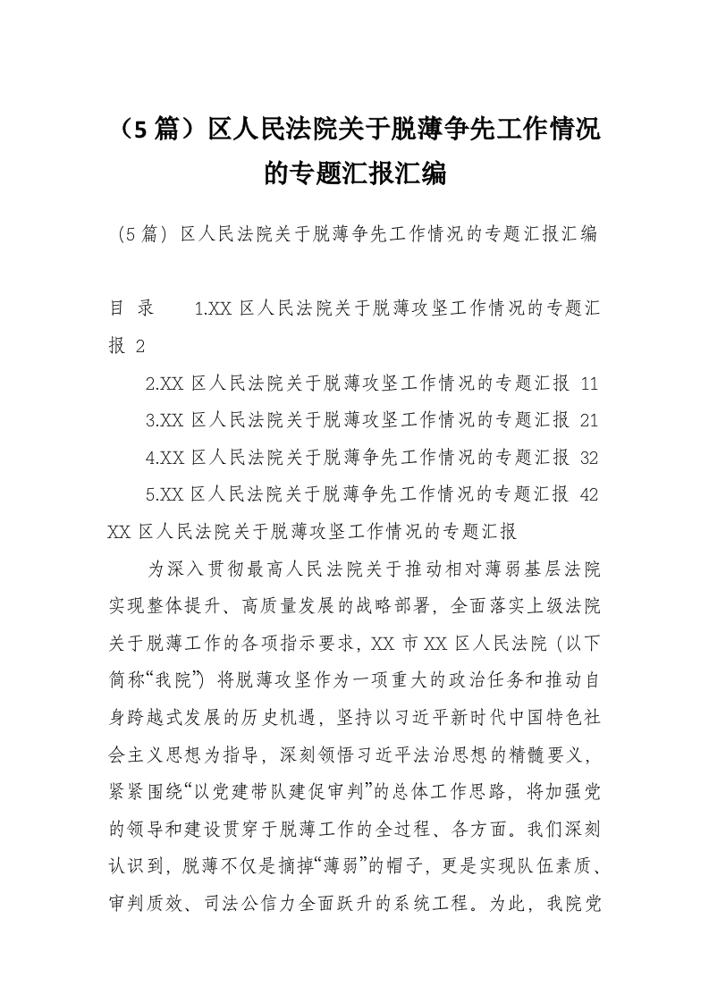 (5篇)区人民法院关于脱薄争先工作情况的专题汇报汇编