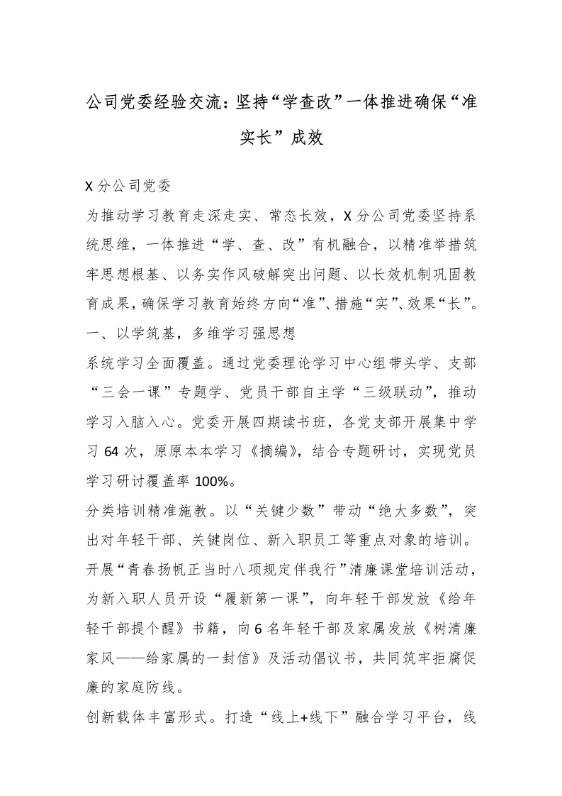 首页工作文档公司党委经验交流:坚持“学查改”一体推进确保“准实长”成效_副本