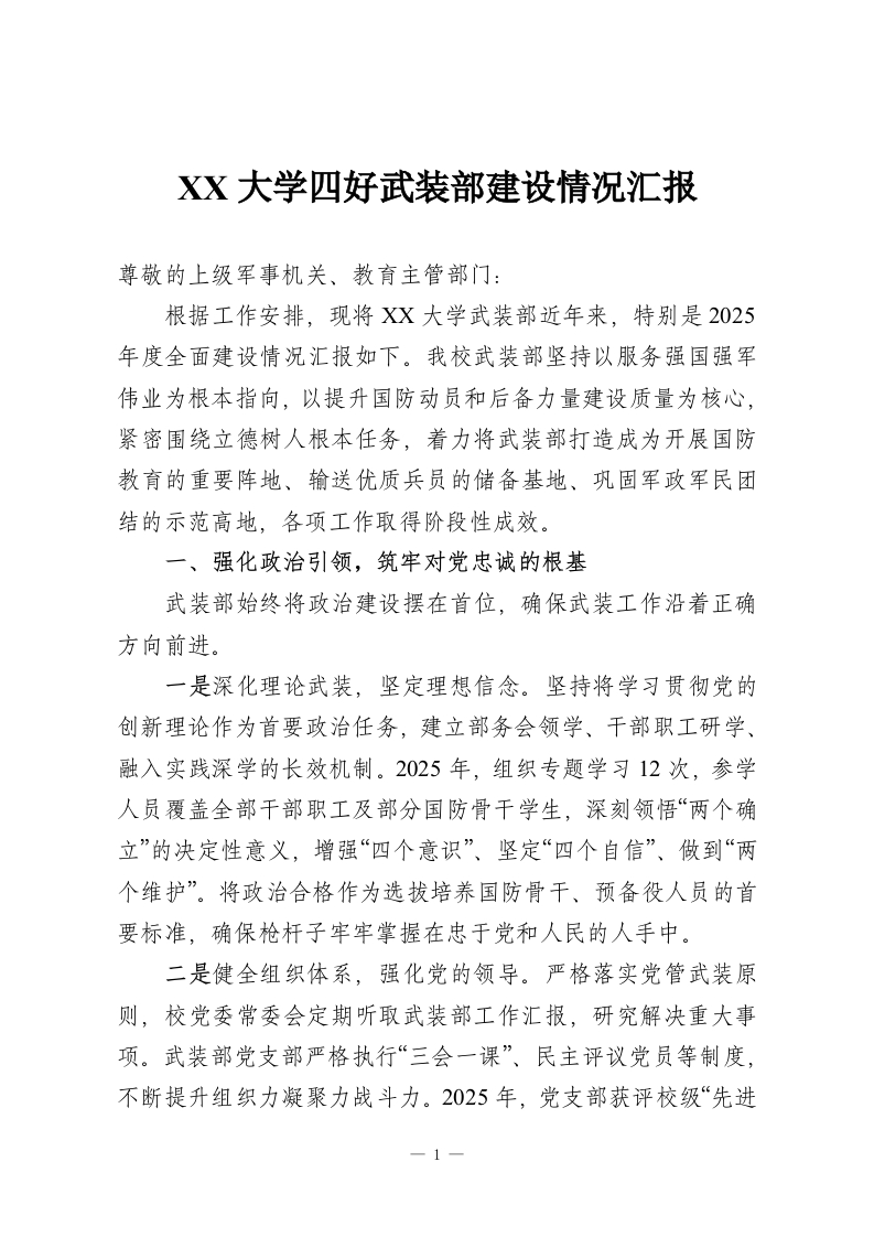 XX大学四好武装部建设情况汇报