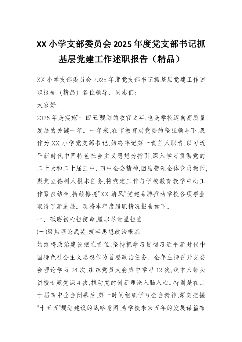 XX小学支部委员会2025年度党支部书记抓基层党建工作述职报告(精品)