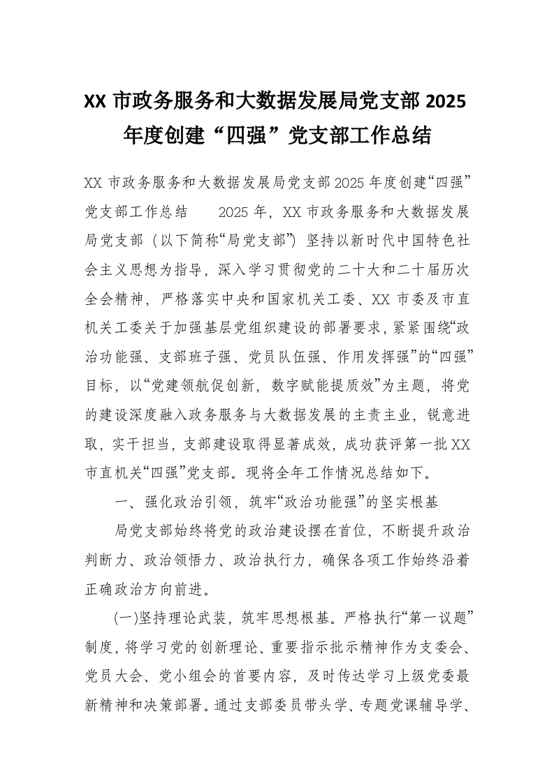 XX市政务服务和大数据发展局党支部2025年度创建“四强”党支部工作总结