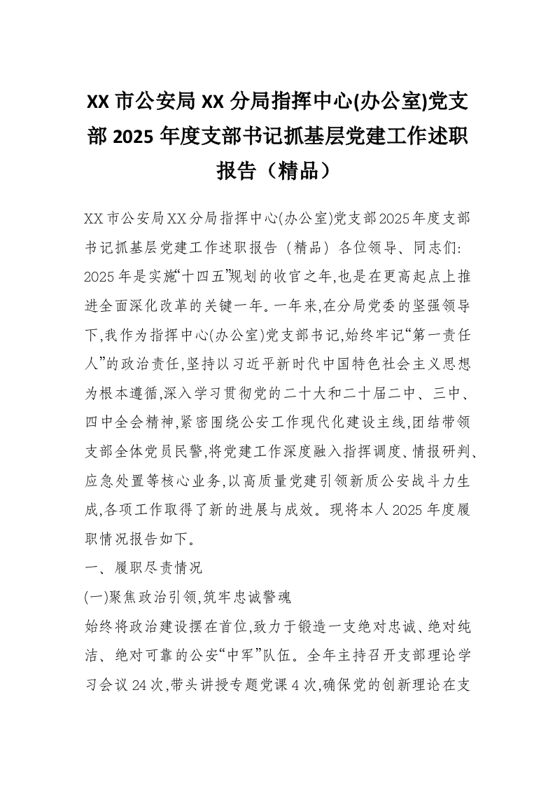 XX市公安局XX分局指挥中心(办公室)党支部2025年度支部书记抓基层党建工作述职报告(精品)