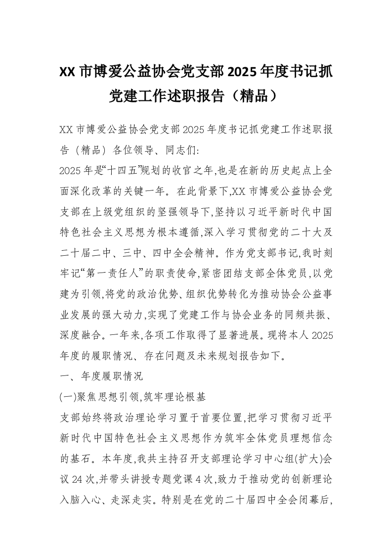 XX市博爱公益协会党支部2025年度书记抓党建工作述职报告(精品)