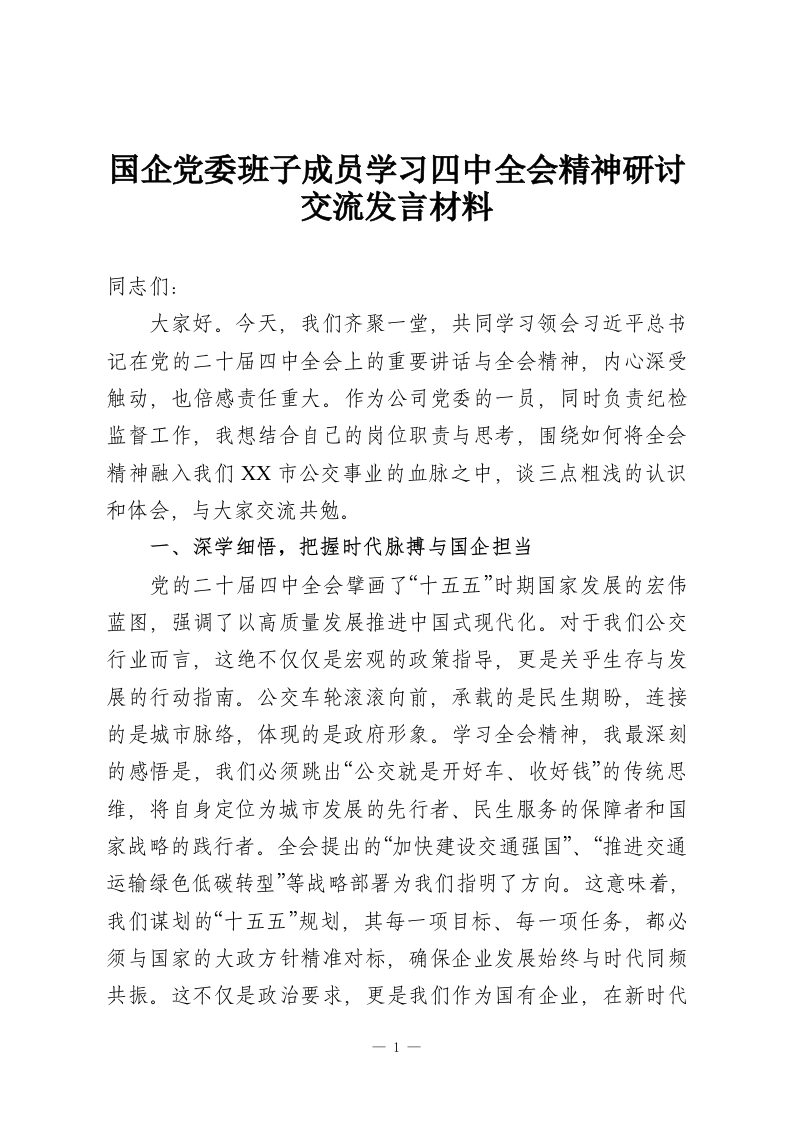 首页精选范文国企党委班子成员学习四中***精神研讨交流发言材料
