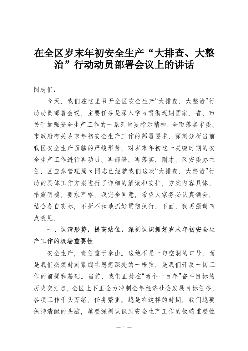 在全区岁末年初安全生产“大排查、大整治”行动动员部署会议上的讲话