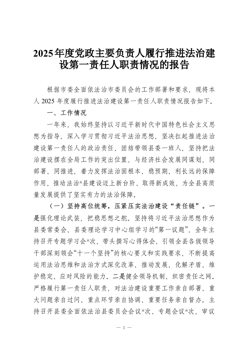 2025年度党政主要负责人履行推进法治建设第一责任人职责情况的报告