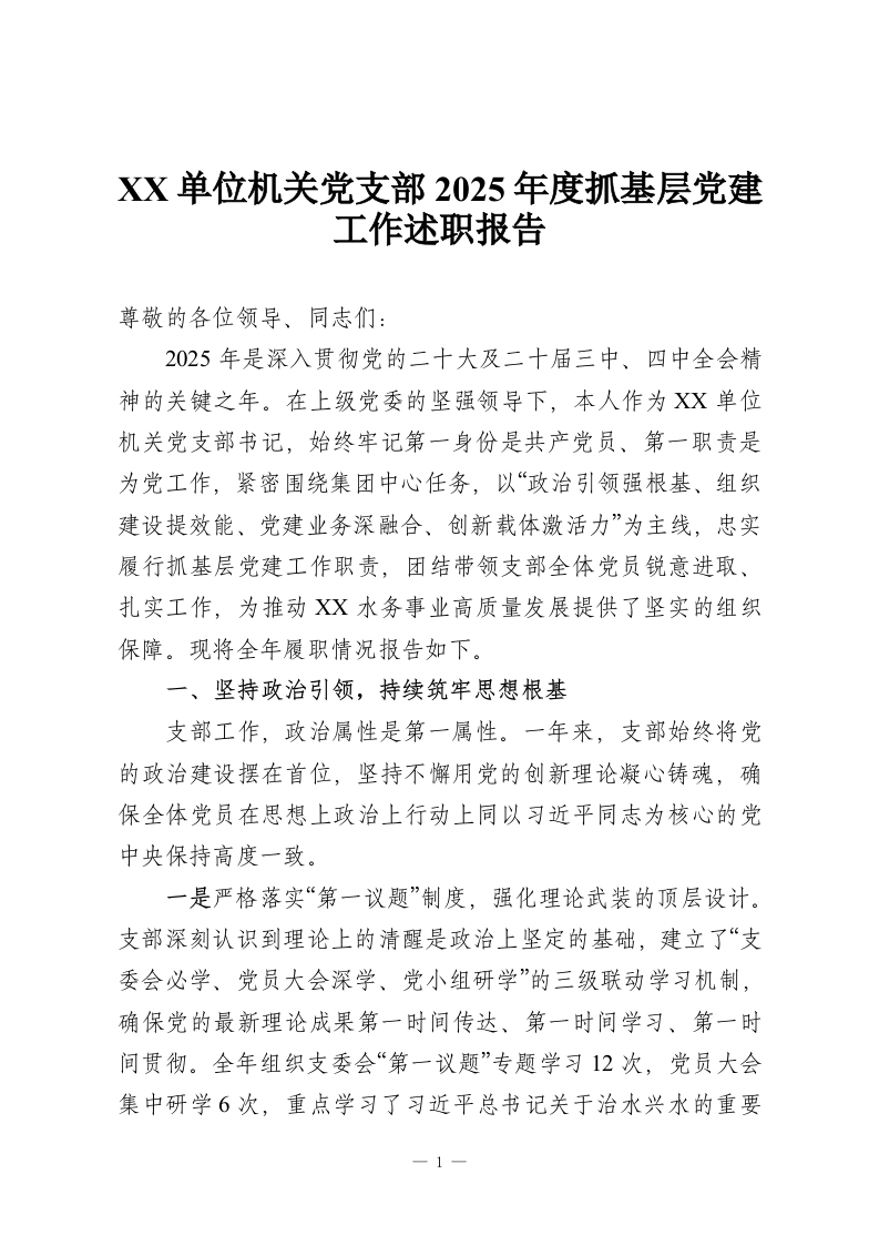 XX单位机关党支部2025年度抓基层党建工作述职报告