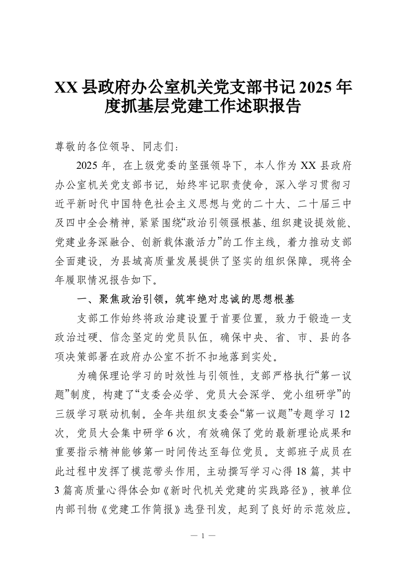 XX县***办公室机关党支部书记2025年度抓基层党建工作述职报告