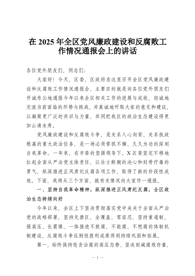 在2025年全区党风廉政建设和反腐败工作情况通报会上的讲话