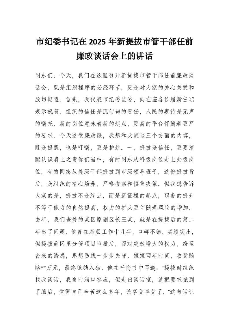 市纪委书记在2025年新提拔市管干部任前廉政谈话会上的讲话