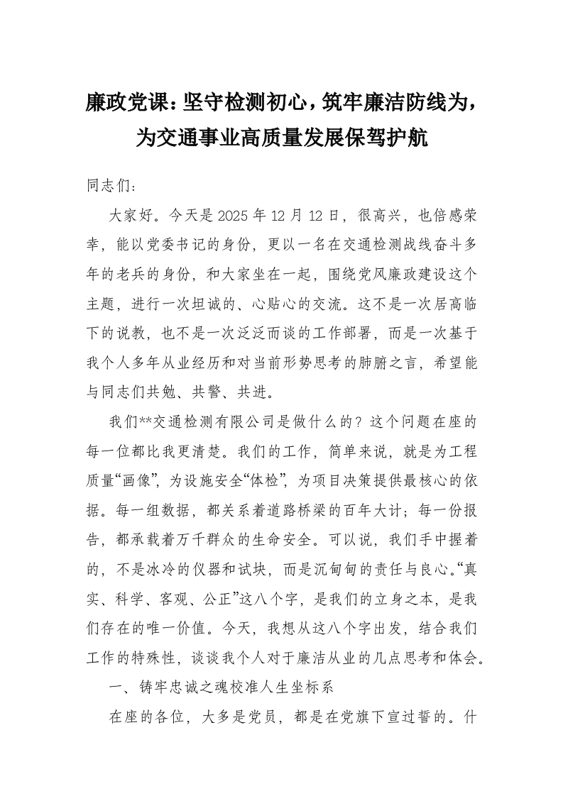 首页材料汇编廉政党课:坚守检测初心,筑牢廉洁防线为,为交通事业高质量发展保驾护航
