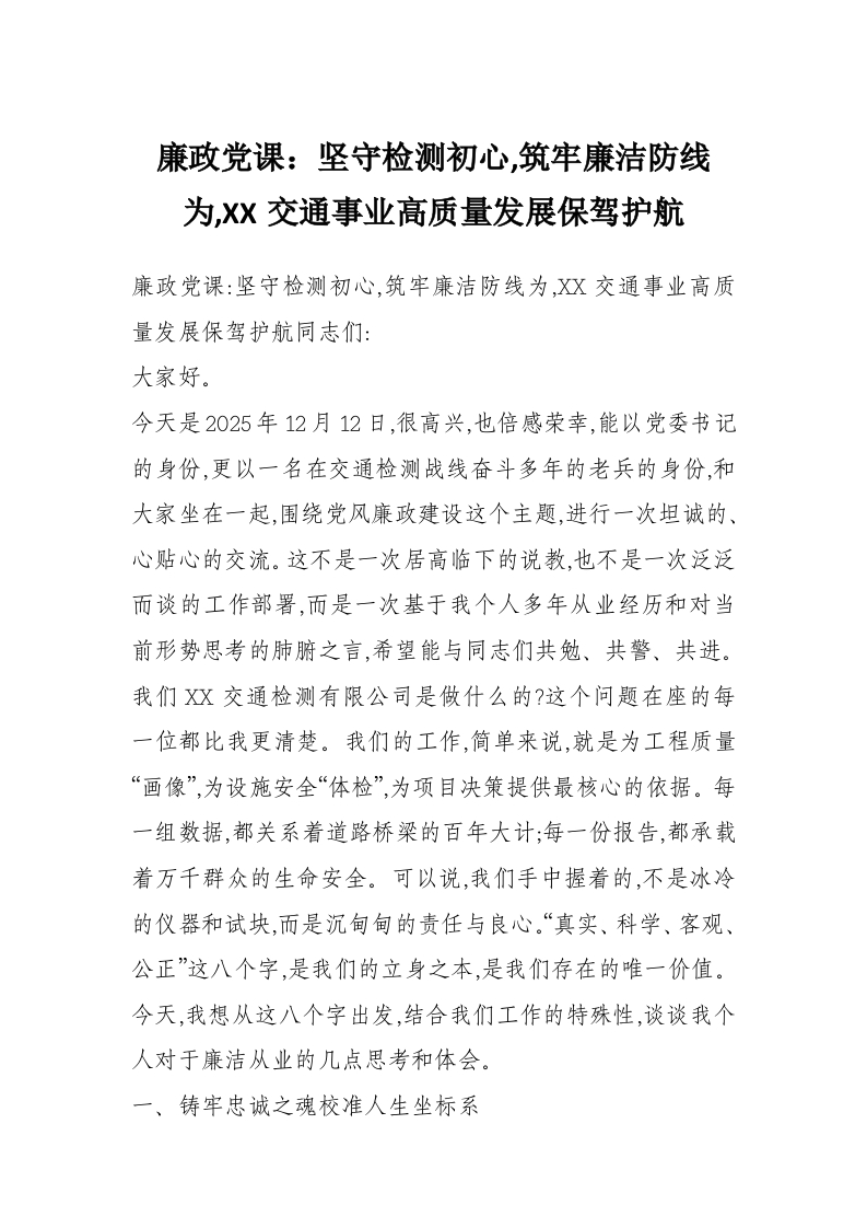 首页材料汇编廉政党课:坚守检测初心,筑牢廉洁防线为,XX交通事业高质量发展保驾护航