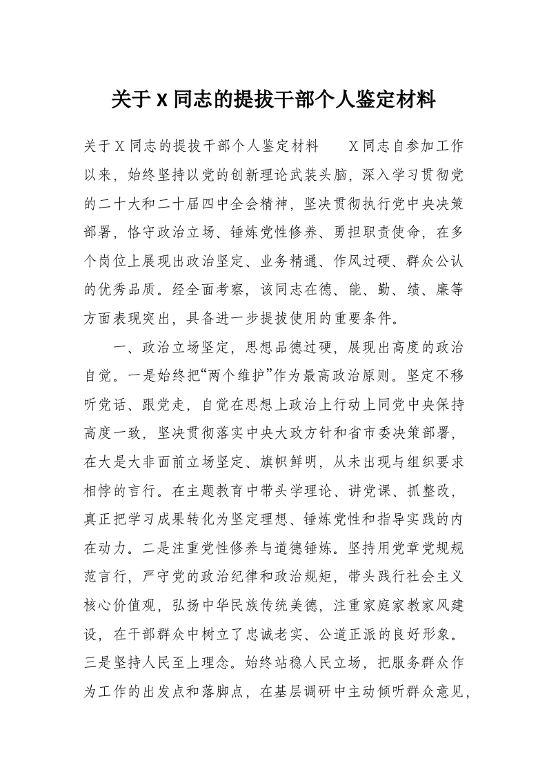首页材料汇编关于X同志的提拔干部个人鉴定材料