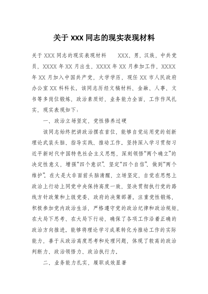 关于XXX同志的现实表现材料