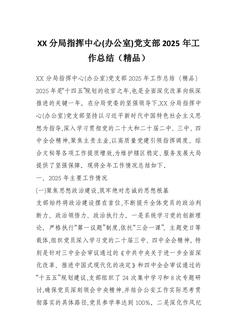 XX分局指挥中心(办公室)党支部2025年工作总结(精品)