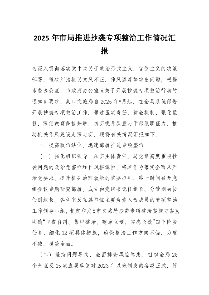 2025年市局推进公文抄袭专项整治工作情况汇报