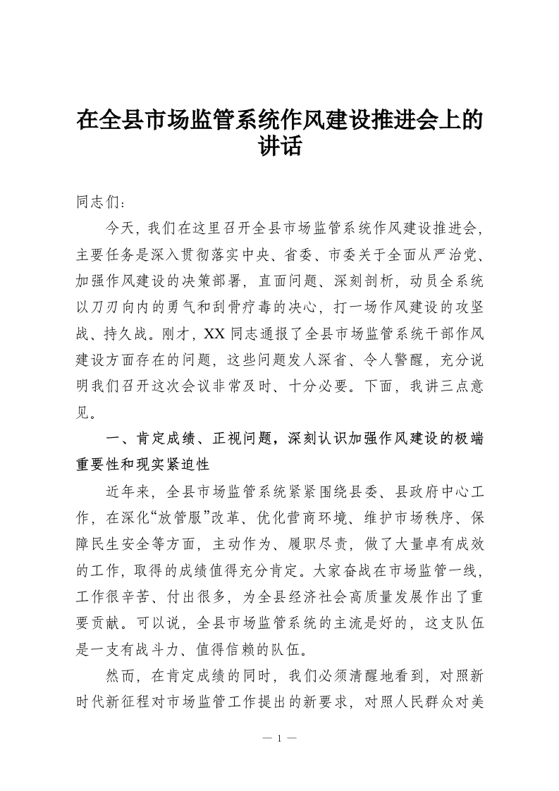 在全县市场监管系统作风建设推进会上的讲话