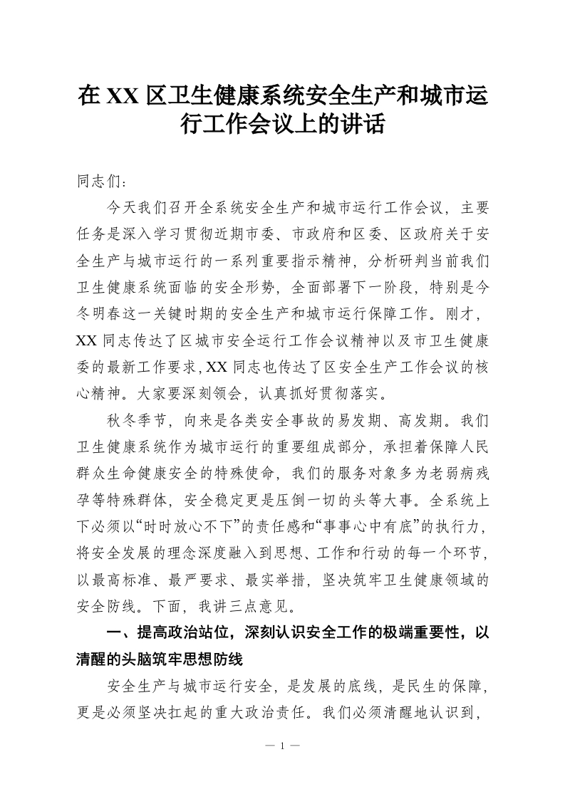 在XX区卫生健康系统安全生产和城市运行工作会议上的讲话