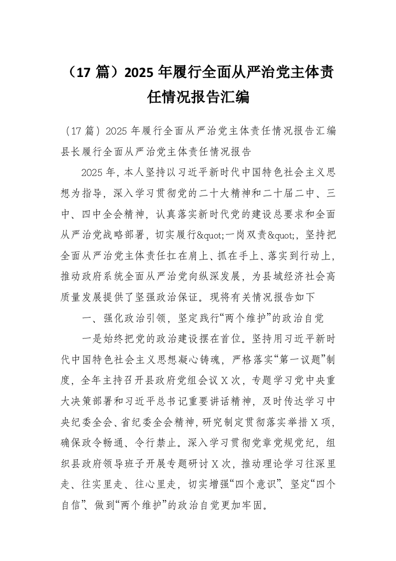 (17篇)2025年履行全面从严治党主体责任情况报告汇编