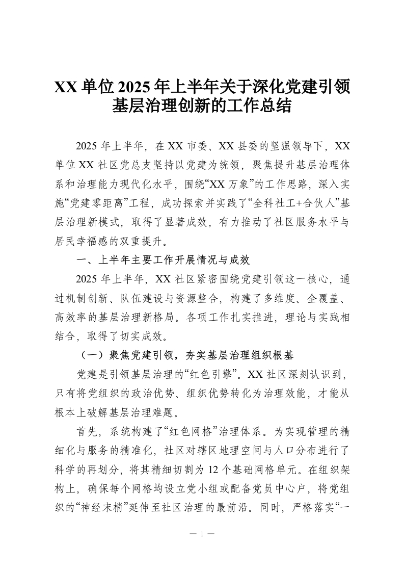XX单位2025年上半年关于深化党建引领基层治理创新的工作总结