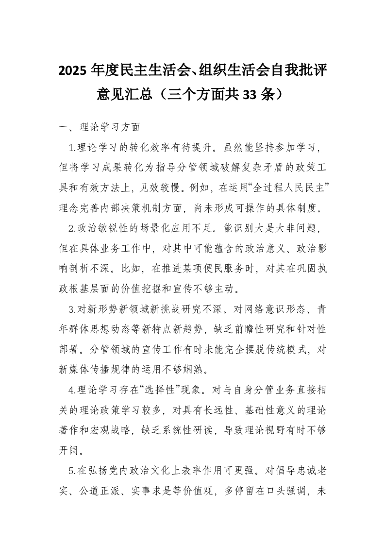 2025年度民主生活会、组织生活会自我批评意见汇总(三个方面共33条)