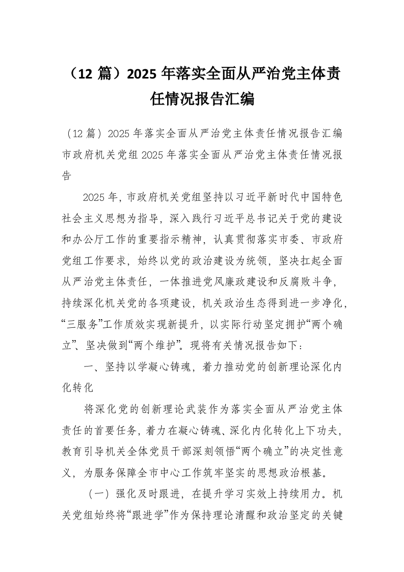 (12篇)2025年落实全面从严治党主体责任情况报告汇编