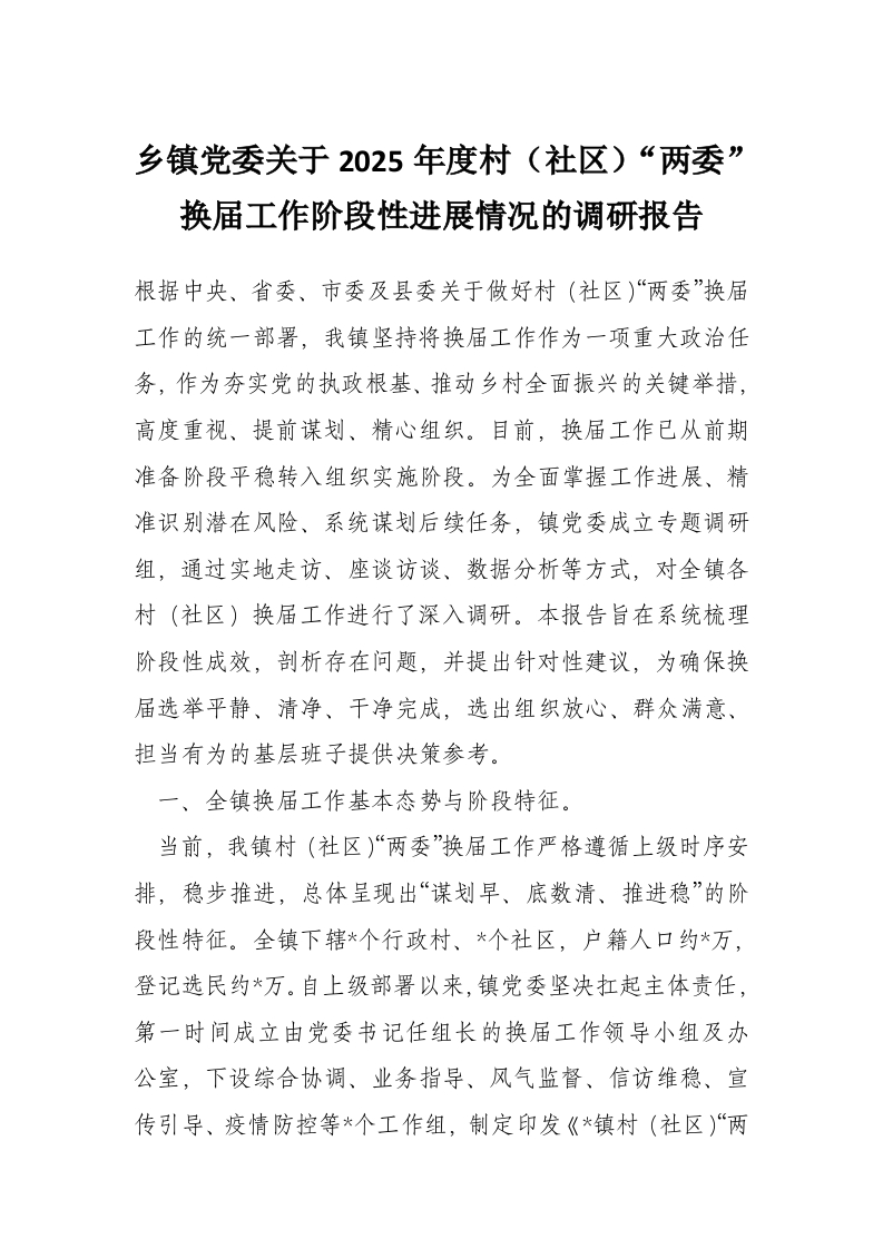 乡镇党委关于2025年度村(社区)“两委”换届工作阶段性进展情况的调研报告