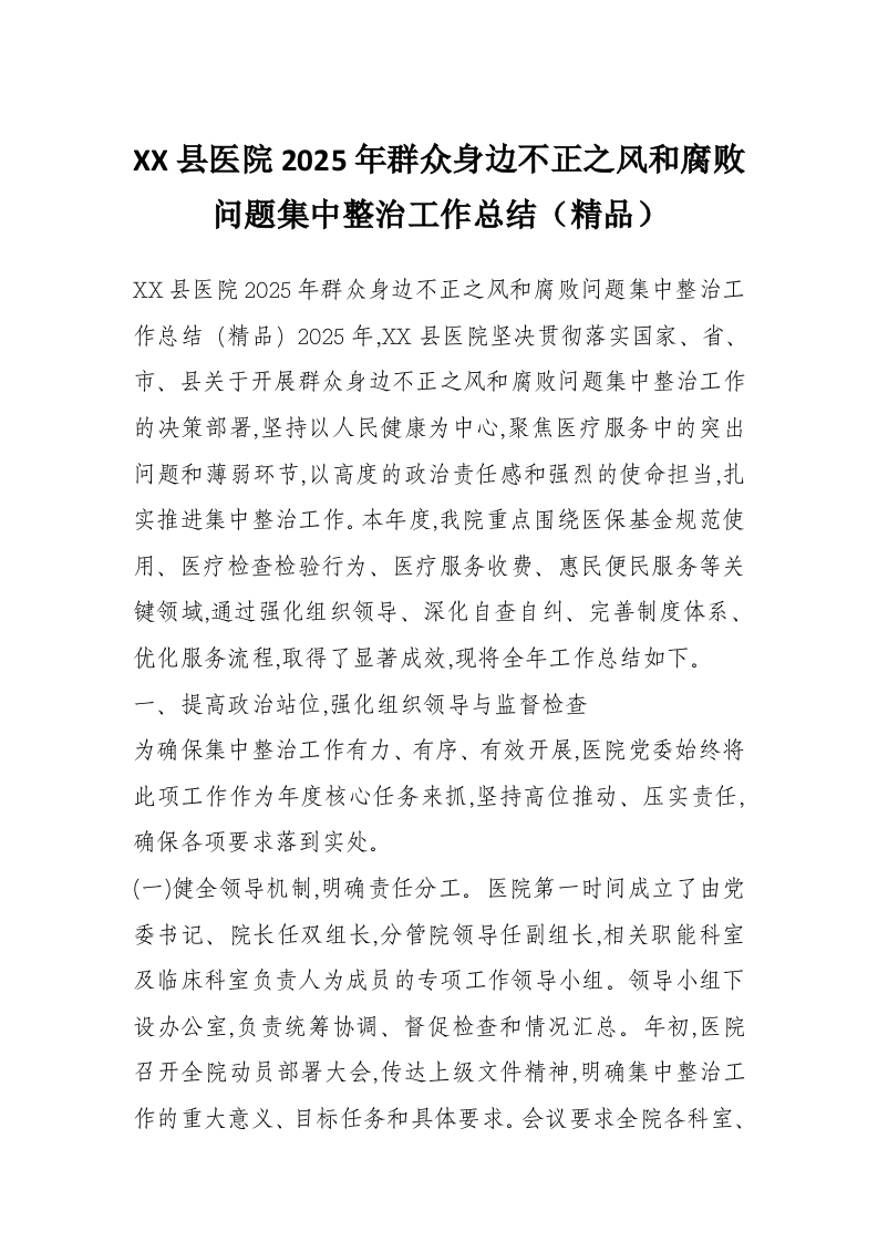 XX县医院2025年群众身边不正之风和腐败问题集中整治工作总结(精品)