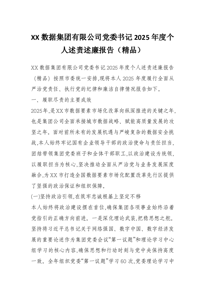 XX数据集团有限公司党委书记2025年度个人述责述廉报告(精品)