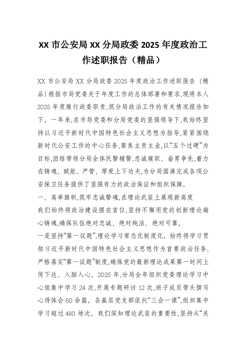 XX市公安局XX分局政委2025年度政治工作述职报告(精品)