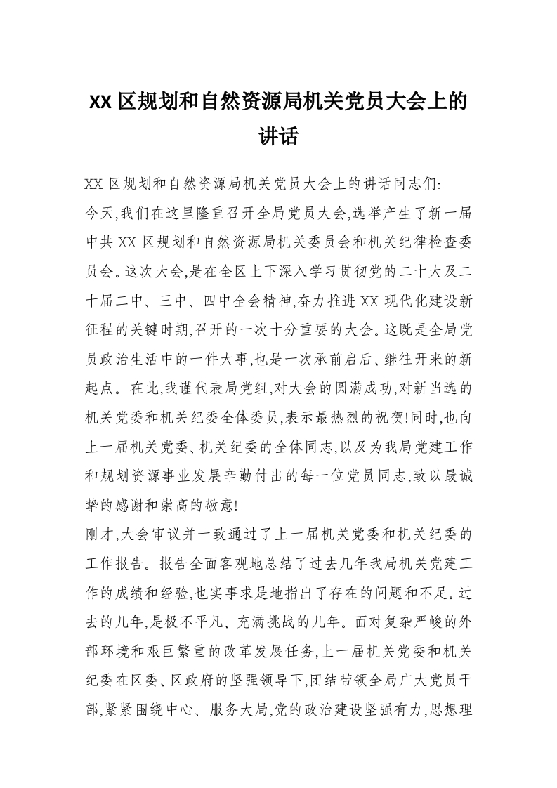首页写作素材XX区规划和自然资源局机关党员大会上的讲话