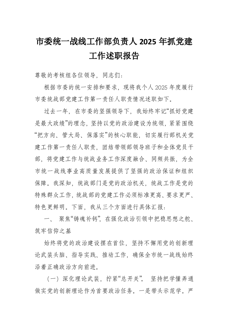 市委统一战线工作部负责人2025年抓党建工作述职报告