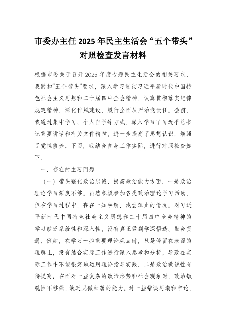 首页学习提升市委办主任2025年民主生活会“五个带头”对照检查发言材料