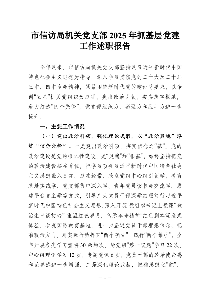 首页工作文档市信访局机关党支部2025年抓基层党建工作述职报告