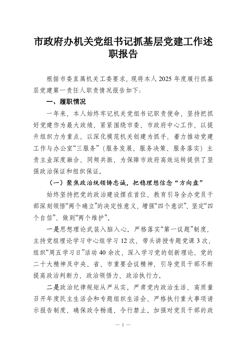 市***办机关党组书记抓基层党建工作述职报告