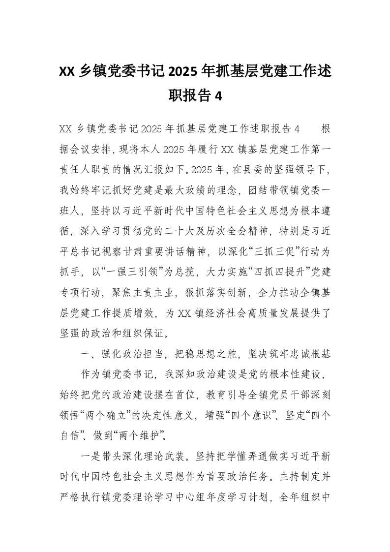 XX乡镇党委书记2025年抓基层党建工作述职报告4