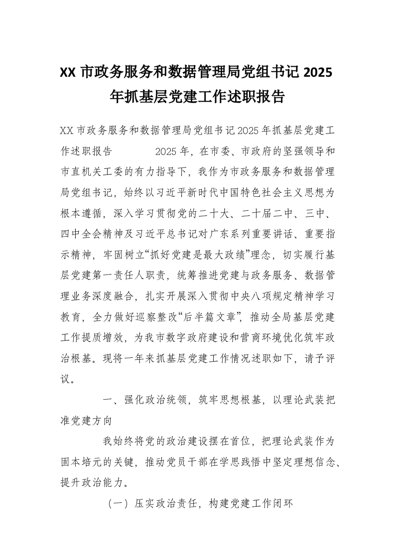 XX市政务服务和数据管理局党组书记2025年抓基层党建工作述职报告