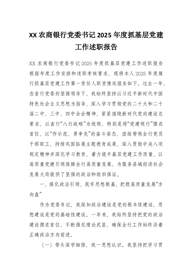 XX农商银行党委书记2025年度抓基层党建工作述职报告