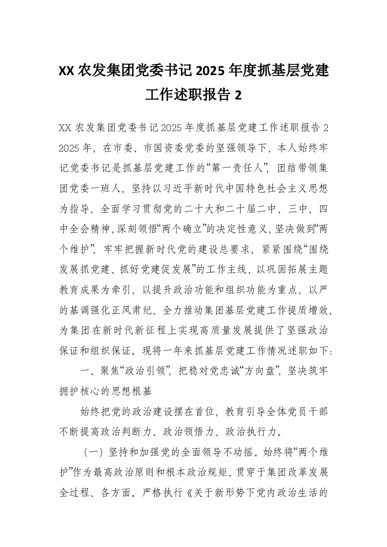XX农发集团党委书记2025年度抓基层党建工作述职报告2