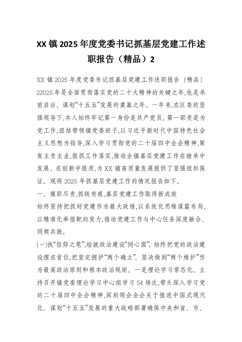 XX镇2025年度党委书记抓基层党建工作述职报告(精品)2