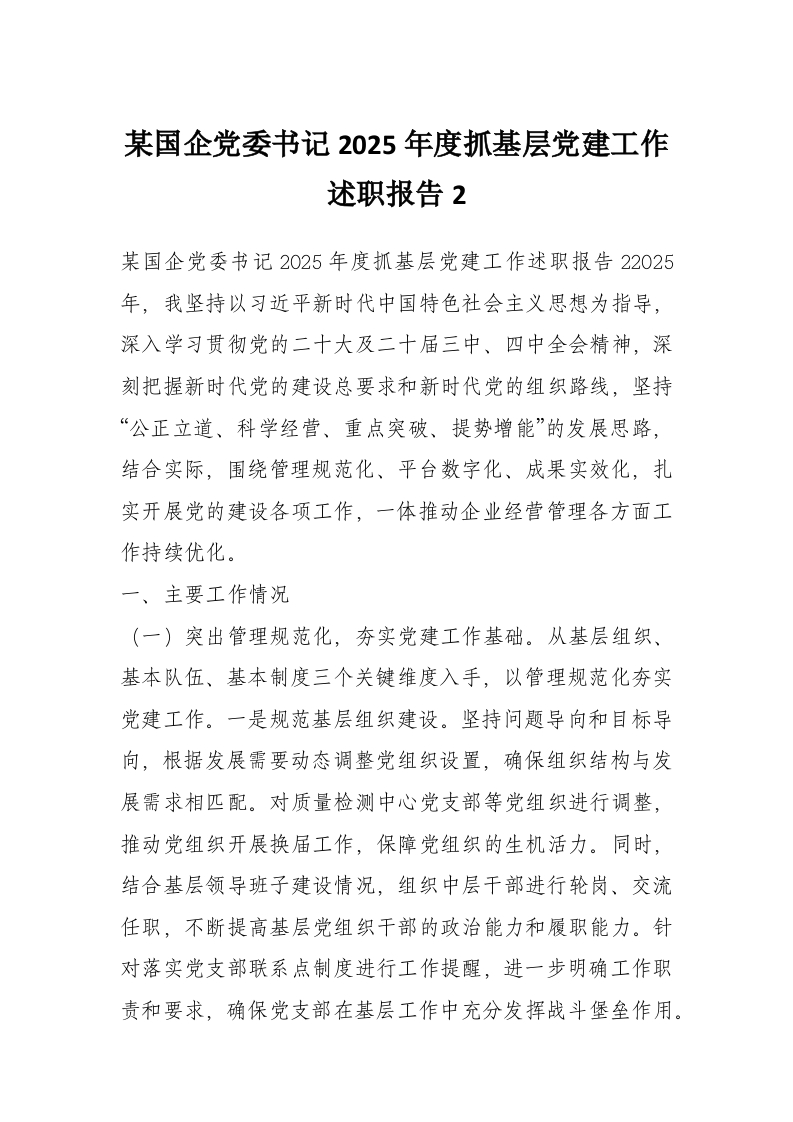 某国企党委书记2025年度抓基层党建工作述职报告2