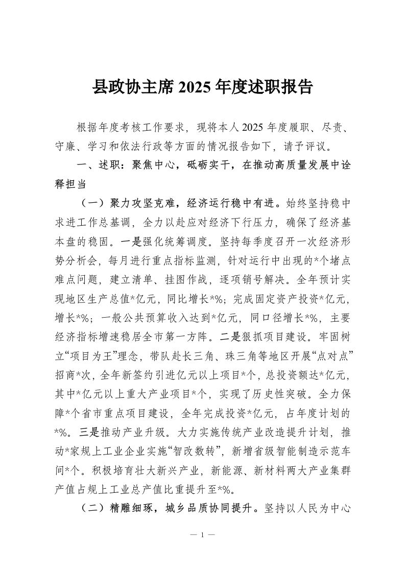 县政协主席2025年度述职报告