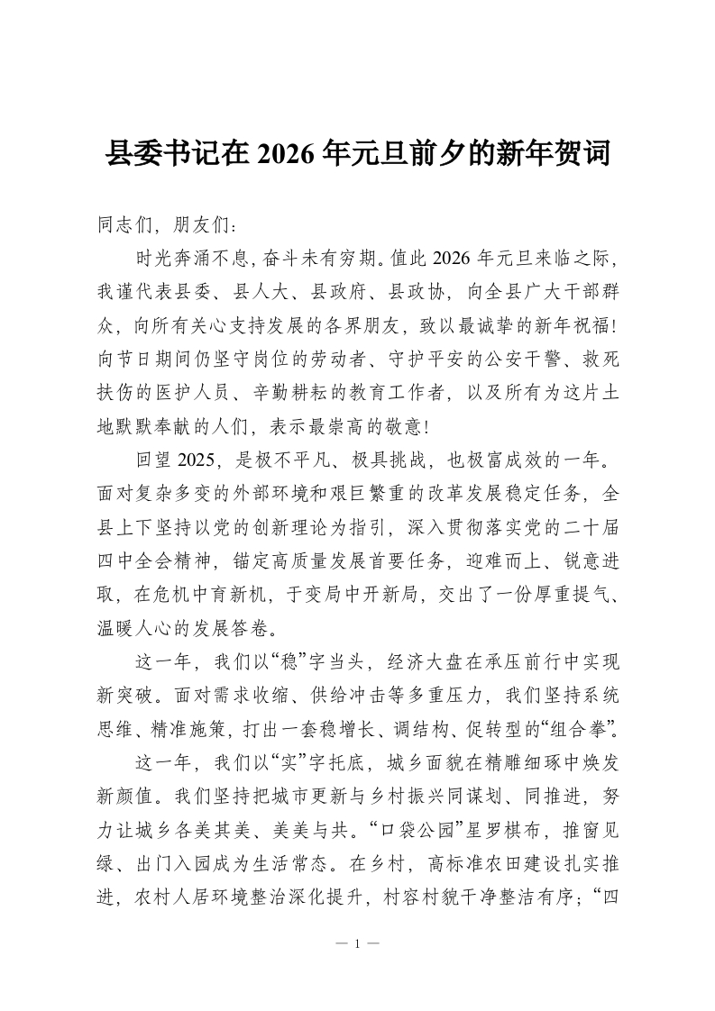 首页讲课讲稿县委书记在2026年元旦前夕的新年贺词