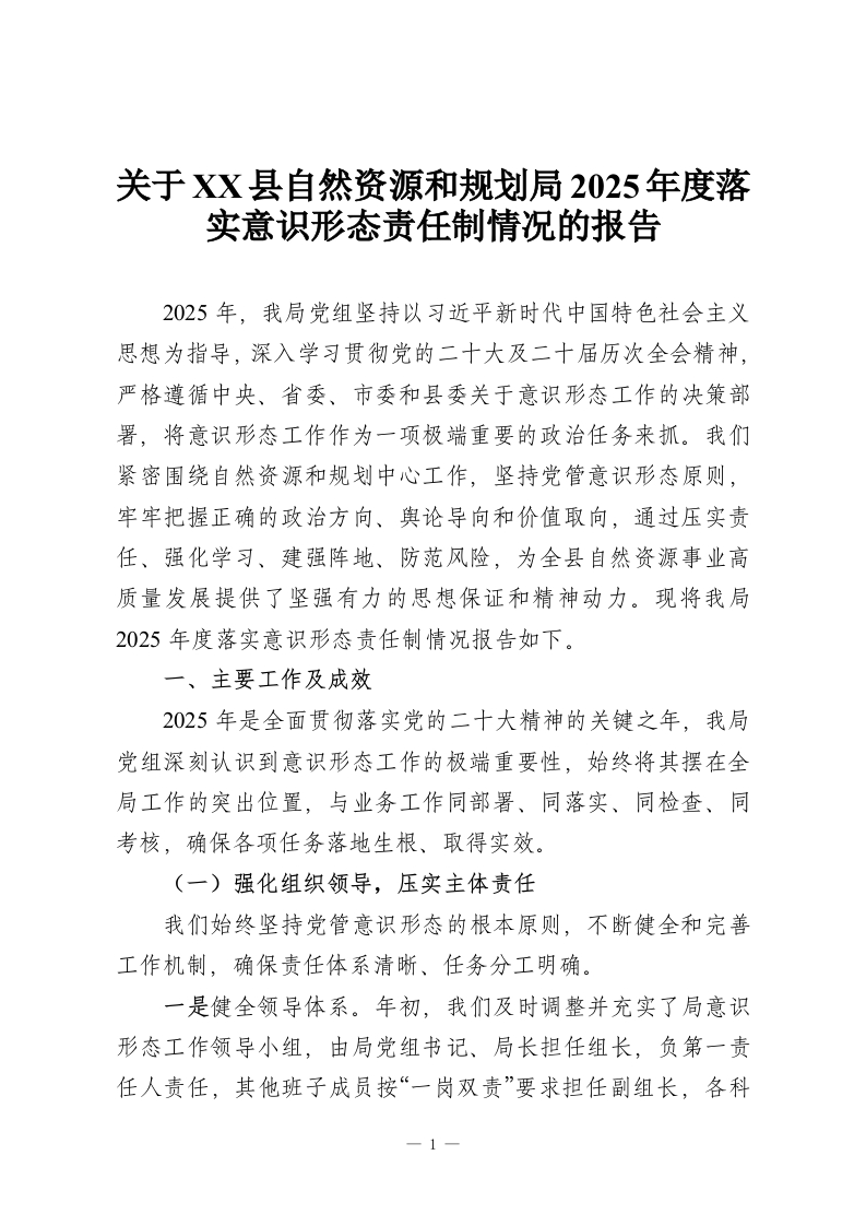 关于XX县自然资源和规划局2025年度落实意识形态责任制情况的报告