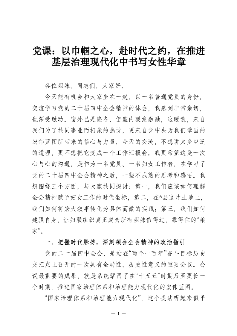 党课:以巾帼之心,赴时代之约,在推进基层治理现代化中书写女性华章