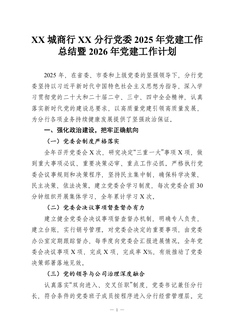 XX城商行XX分行党委2025年党建工作总结暨2026年党建工作计划