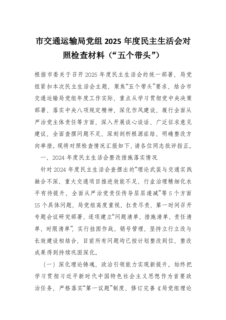首页工作文档市交通运输局党组2025年度民主生活会对照检查材料(“五个带头”)