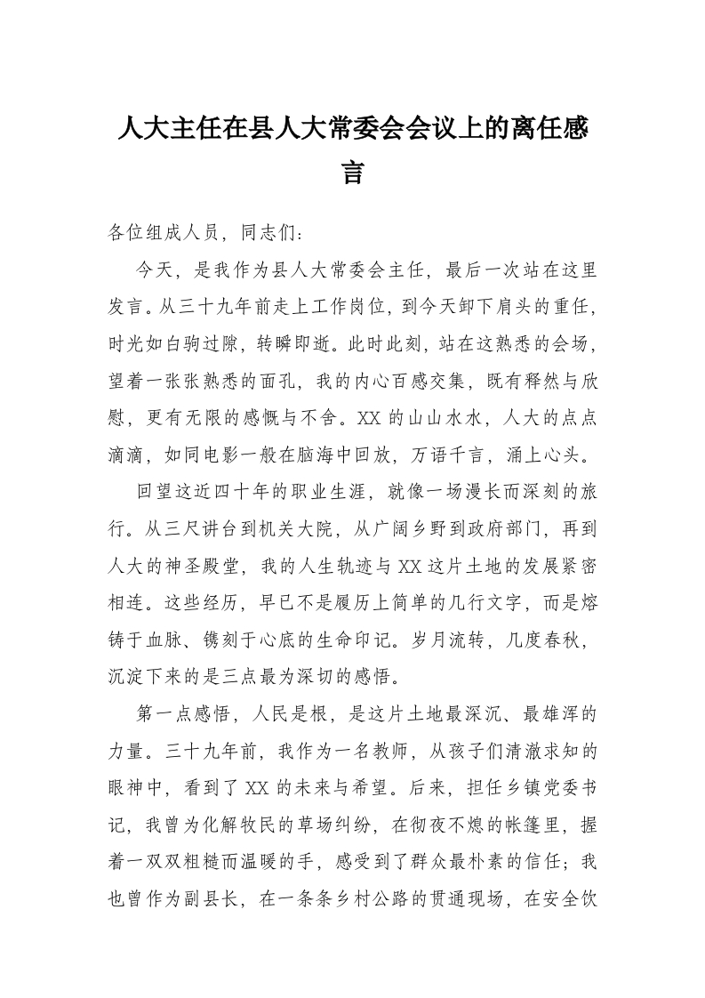 首页工作文档人大主任在县人大常委会会议上的离任感言