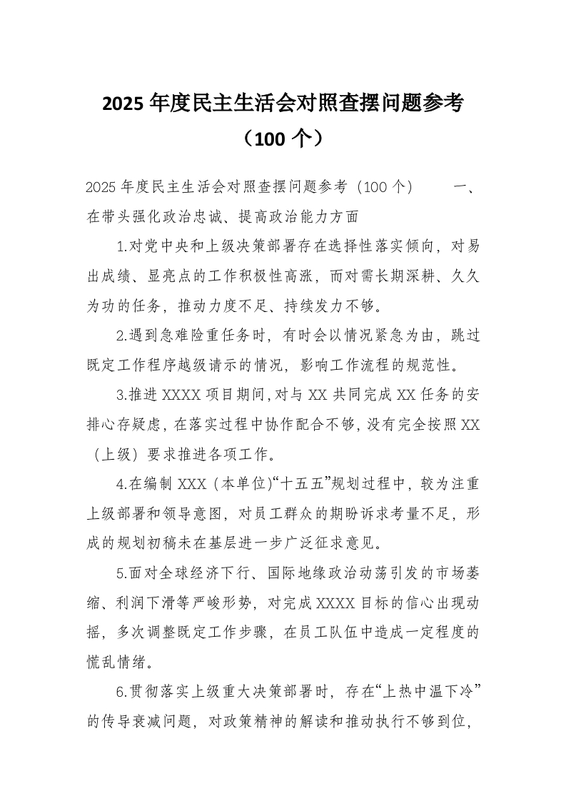 2025年度民主生活会对照查摆问题参考(100个)