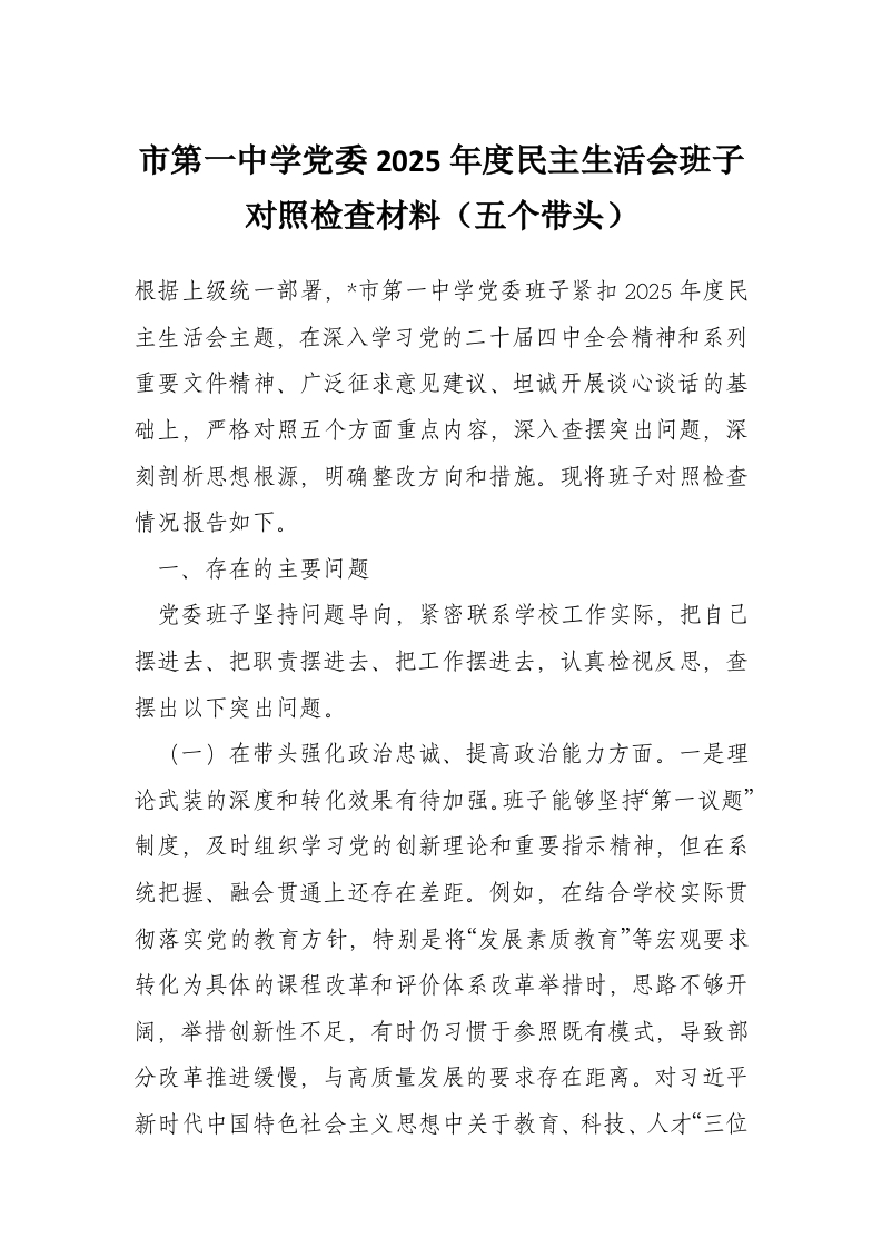 首页写作素材市第一中学党委2025年度民主生活会班子对照检查材料(五个带头)